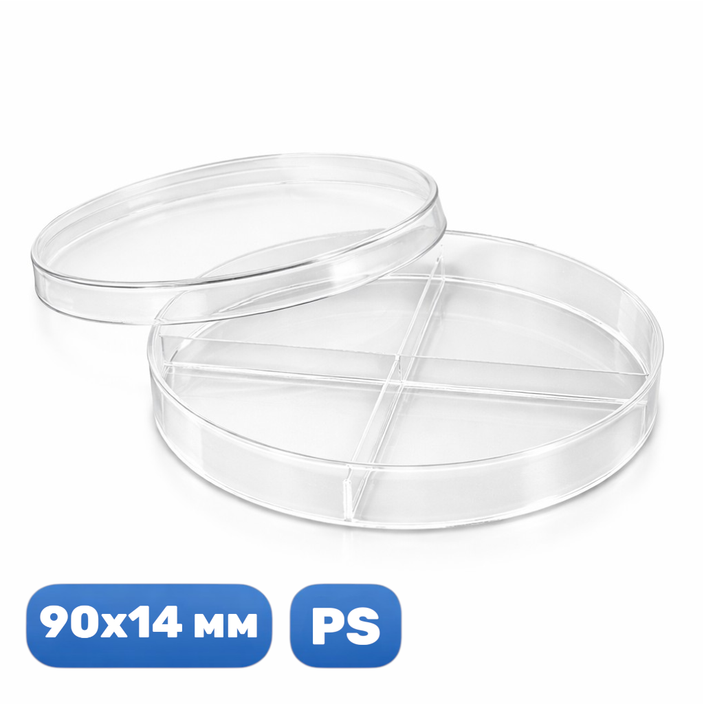 Чашка Петри 90/14 мм, п/с, 4-х секц., стерил., 20 шт/упак, IT. предназначена для культивирования, разделения, наблюдения и сравнительного анализа микроорганизмов, клеточных культур и биологических образцов в лабораторных условиях. Чашка Петри с азделительными секциями удобна для одновременной работы с несколькими пробами или питательными средами в пределах одной емкости.