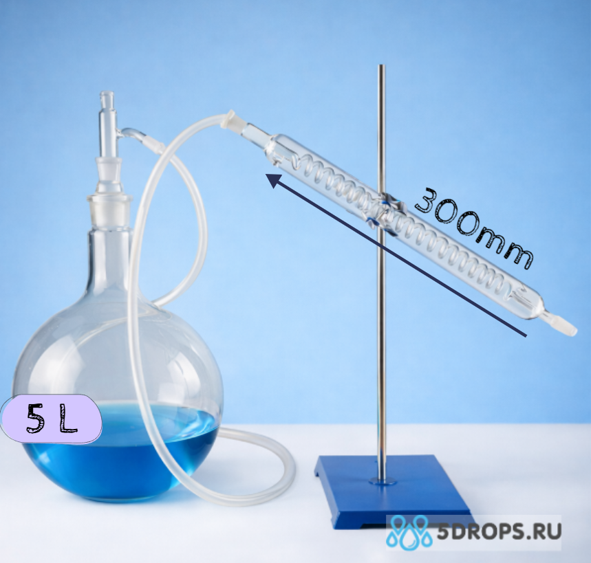 Конструкция включает плоскодонную перегонную колбу объемом 5000 мл и змеевиковый холодильник на 16 витков. Спиральная форма холодильника обеспечивает развитую поверхность теплообмена и эффективную конденсацию паров при циркуляции охлаждающей воды. Стандартные шлифовые соединения обеспечивают совместимость с дополнительными лабораторными элементами.