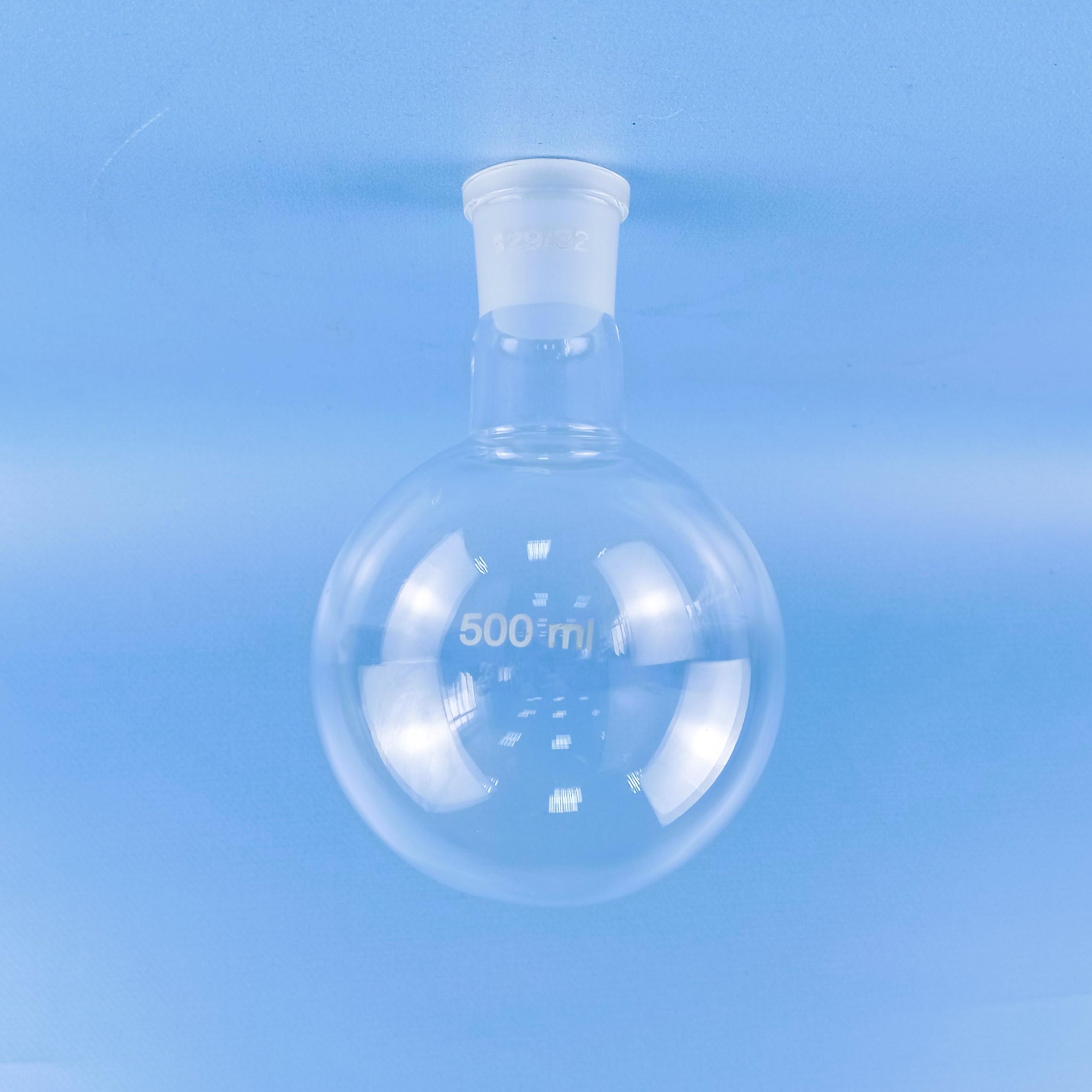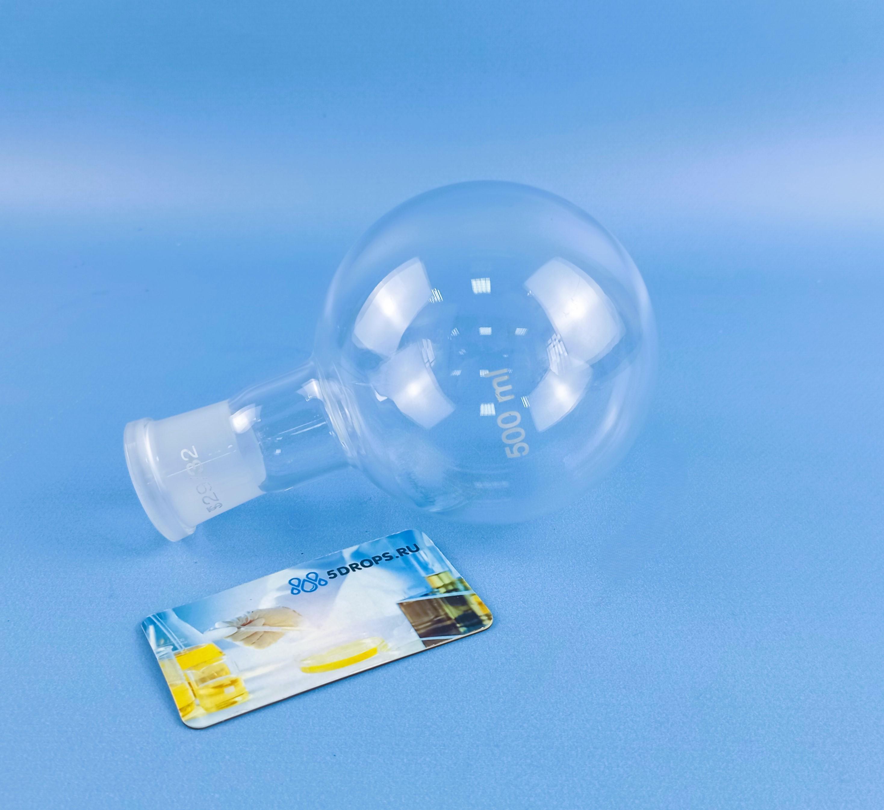 Колба круглодонная 5drops К-1-500-29/32 со шлифом, 500 мл. Колба круглодонная 5drops К-1-500-29/32 со шлифом, 500 мл - универсальная лабораторная ёмкость, пригодная для проведения разнообразных химических процессов, а также для использования в качестве небольшой перегонной колбы при проведении процесса перегонки или дистилляции. Шарообразное дно не допускает вертикальную установку ёмкости на плоскости, но не препятствует расположению на наклонной поверхности, также для устойчивого крепления можно использовать штатив. Термостойкое химически инертное стекло, из которого изготовлена колба, допускает проводить нагрев как на электрической, так и на газовой, и даже на индукционной плите. Среди ощутимых плюсов при использовании круглодонной колбы в качестве перегонной ёмкости также следует выделить абсолютную наглядность происходящих в ней процессов, что выгодно отличает её от тех же металлических перегонных кубов