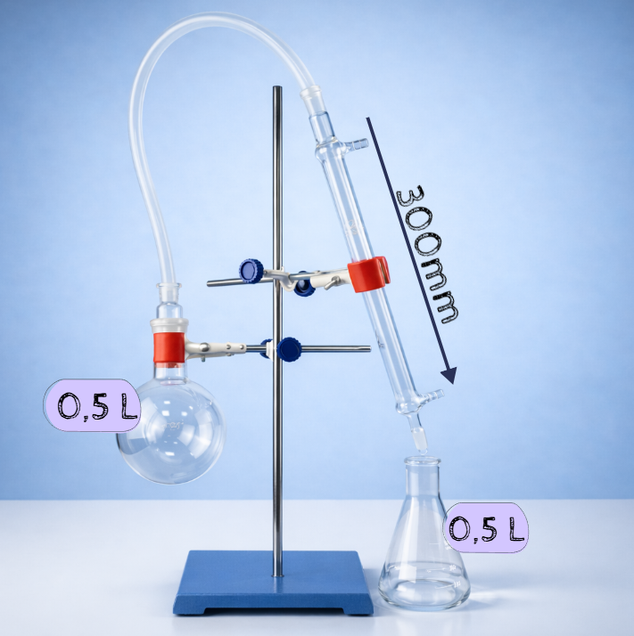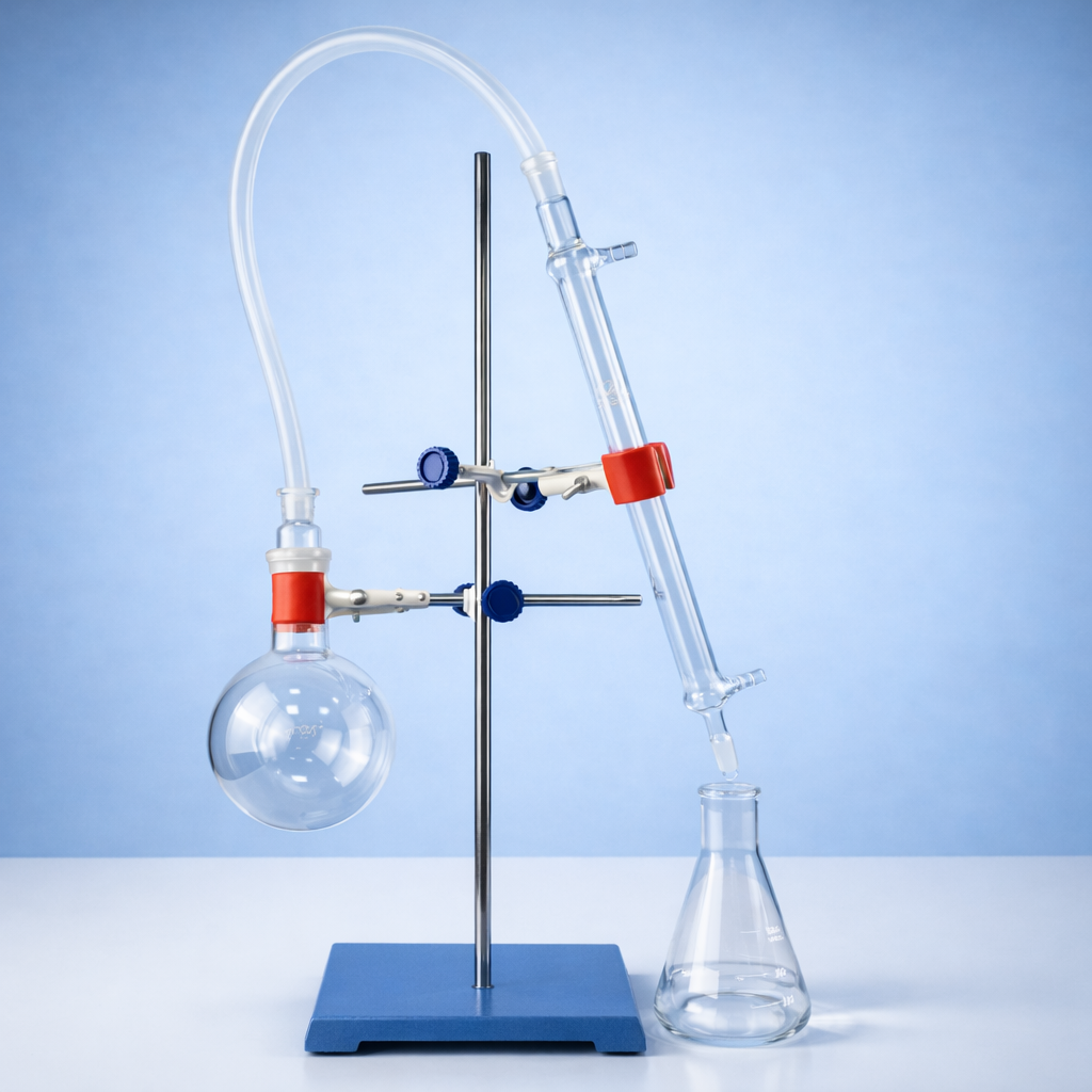 Конструкция устанавливается на лабораторный штатив с основанием и лапкой, что обеспечивает устойчивость и удобство регулировки положения элементов. Прозрачность стеклянной аппаратуры позволяет контролировать стадии кипения, испарения и конденсации, что особенно важно в учебных и демонстрационных целях.