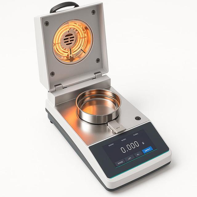 Лабораторный термогравиметрический анализатор влажности 5drops-MBA1103, до 110 г, ц.д. 0,001 г. лабораторный термогравиметрический анализатор: образец взвешивается, затем высушивается галогенной лампой при заданной температуре, и прибор непрерывно рассчитывает потерю массы как влагу. Конструкция включает тензодатчик высокой чувствительности, галогенный нагрев (40–160 °C с шагом 1 °C), датчик температуры PT-100-2, алюминиевую чашку диаметром около 96 мм, сенсорный дисплей и интерфейс RS-232 для выгрузки данных (есть график «динамической кривой» в реальном времени). Такой набор даёт быстрый «скрининг» влажности на местах, без длительной термостатной сушки в печи.