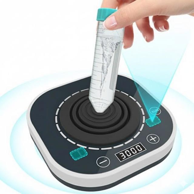 - Время на каждую пробу — смеситель сам стартует при поднесении пробирки и останавливается при отводе руки, без нажатия на площадку.