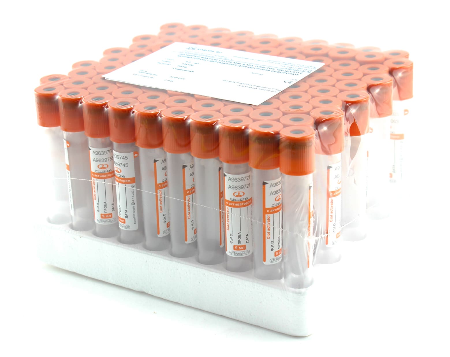 Вакуумные пробирки для взятия венозной крови с активатором свёртывания - применяются при исследованиях сыворотки в клинической химии, серологии, иммунологии. Пробирки содержат наполнитель оксид кремния (SiO2), который также называют кремний или кремнезем, его напыляют на внутренние стенки пробирок. Микронизированный кремнезем действует на тромбоцитарное звено и плазменный гемостаз. Активатор в пробирке химически инертен, нерастворим в воде, органических растворителях, стойкий к действию ферментов и клеток крови. Благодаря наличию наполнителя в пробирке - резко ускоряется процесс свертывания крови, которая полностью сворачивается за 30 минут, что значительно сокращает время приготовления биологической пробы.