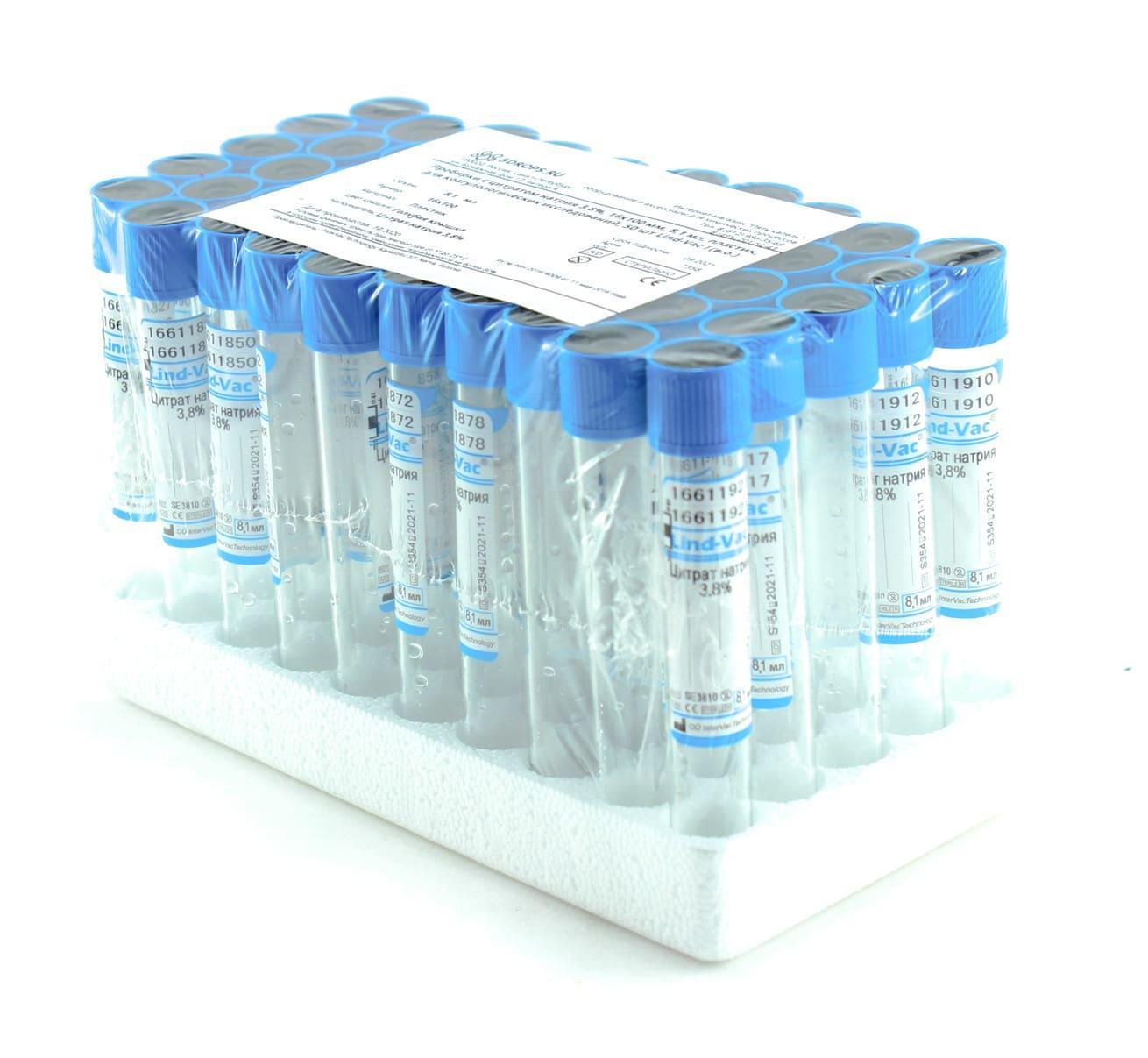 Вакуумные пробирки для коагулологических исследований с цитратом натрия - используются при исследованиях систем гемостаза; коагуляционных свойств крови: протромбин, тромбопластин, фибриноген, факторы свертывания. Пробирки заполнены буферным раствором цитрата натрия, представленного в двух концентрациях - 0.109 моль/л. (3.2%) или 0.129 моль/л (3.8%). Выбор концентрации зависит от принятой практики лаборатории. Цитрат натрия является антикоагулянтом для сбора венозной крови с целью проведения исследований коагуляционных свойств крови. Одна часть буфера цитрата натрия смешивается с девятью частями крови (соотношение к количеству забираемой крови 1/9), pH крови остается в пределах 7.1-7.35 (важно для протромбиновых параметров). При взятии проб крови в несколько пробирок у одного пациента пробирка с цитратом должна заполняться до пробирки с активатором свертывания. Очень важно соблюдать правильное соотношение кровь антикоагулянт в пробе с цитратом. Недостаток цитрата в пробе ведет к образованию микросгустков и/или коагуляции пробы, а избыток цитрата — к искажению результатов анализа за счет связывания кальция из реагентов. Сразу после взятия образца пробирку с цитратом необходимо аккуратного перемешать не менее 5 раз для предотвращения образования микросгустков.