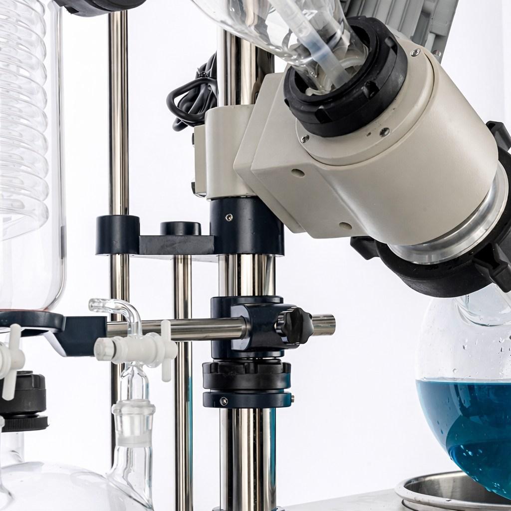 Ротационные испарители относятся к оборудованию для вакуумной дистилляции и концентрирования жидкостей. Принцип их работы основан на одновременном нагреве и вращении испарительной колбы под разрежением: при вращении жидкость распределяется тонкой пленкой по внутренней поверхности колбы, что увеличивает площадь испарения и ускоряет процесс. Пары растворителя отводятся в конденсатор, охлаждаются и собираются в приемной колбе.