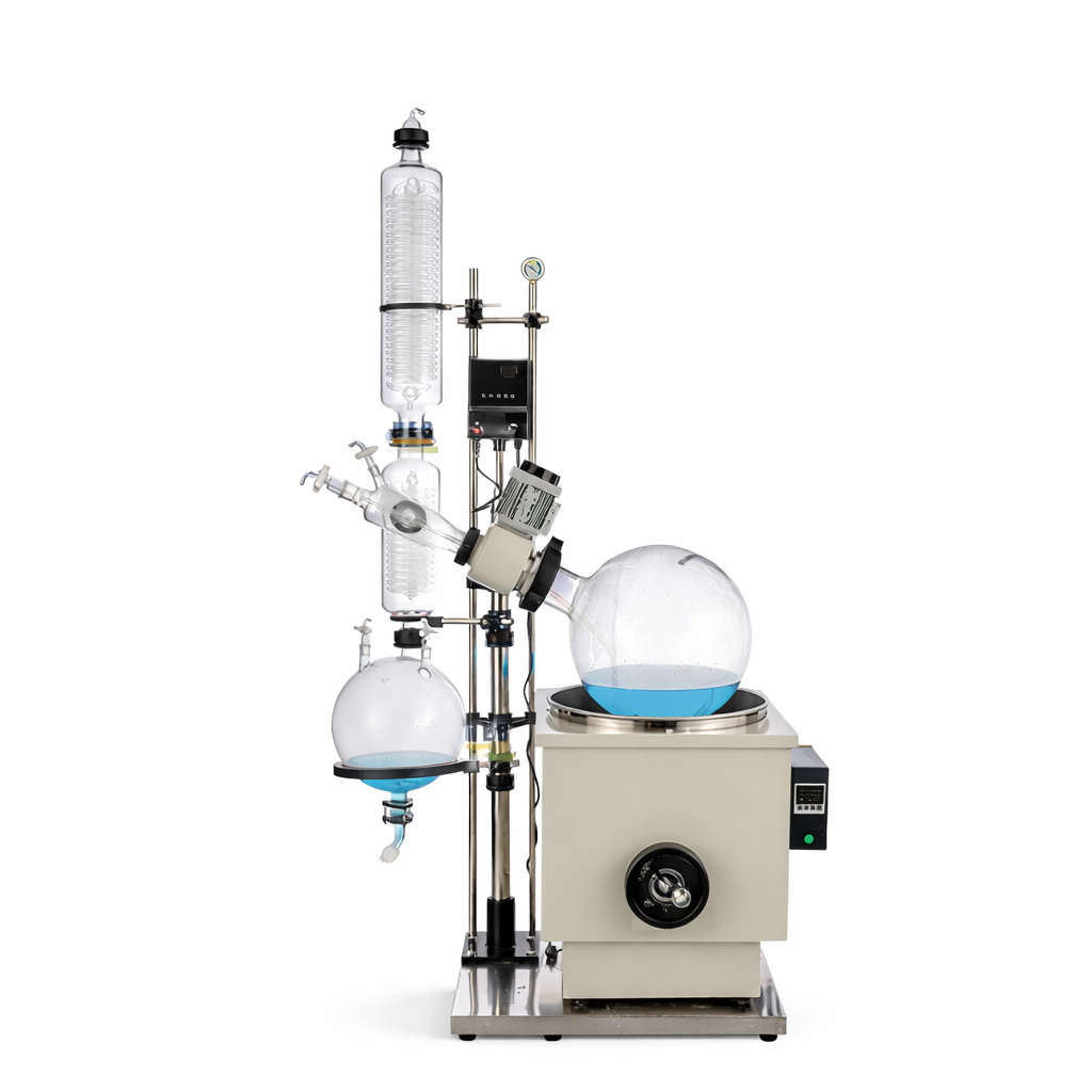 Ротационные испарители относятся к оборудованию для вакуумной дистилляции и концентрирования жидкостей. Принцип их работы основан на одновременном нагреве и вращении испарительной колбы под разрежением: при вращении жидкость распределяется тонкой пленкой по внутренней поверхности колбы, что увеличивает площадь испарения и ускоряет процесс. Пары растворителя отводятся в конденсатор, охлаждаются и собираются в приемной колбе.