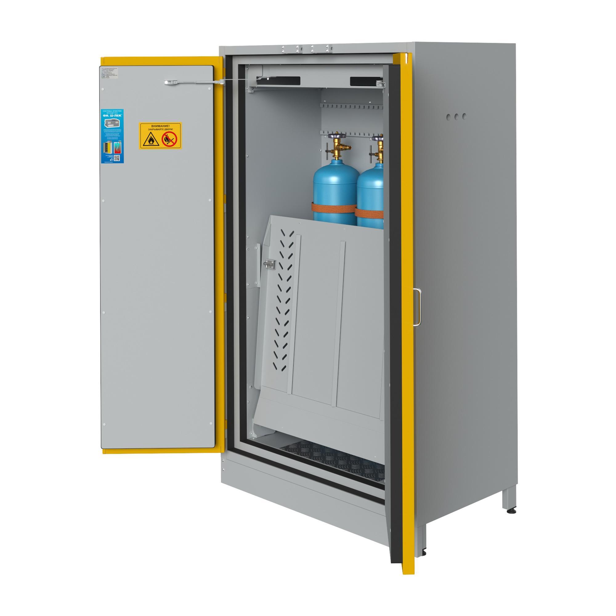 Шкаф ЛВЖ, 1180x650x1985 мм, для хранения газовых баллонов, металл., корпус, огнеупорный. предназначен для безопасного хранения легковоспламеняющихся жидкостей в лабораториях и производственных помещениях. Корпус из стали 1,2 мм с эпоксиполиэфирным порошковым покрытием сформирован по принципу «двойной оболочки» с огнеупорной изоляцией; применены терморасширяющиеся уплотнители 7+4 см. Двери - распашные, с автодоводом (автоматический возврат); предусмотрена система пассивной вентиляции с двумя предохранительными клапанами (70 ± 10 °С) и наружным фланцем Ø100 мм для подключения к вытяжке. Оснащение: искробезопасные петли, цилиндровый замок, клемма заземления, регулируемые опоры. Испытания проведены по ГОСТ Р 50862-2017, огнестойкость Б90.