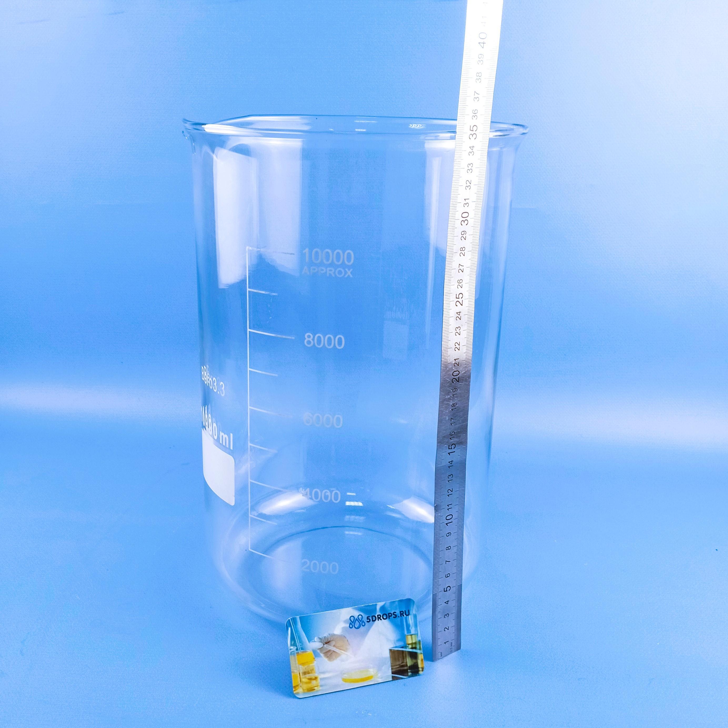 Стакан лабораторный низкий 5drops Н-1-10 000, Boro 3.3, градуированный, 10 000 мл - специальная лабораторная измерительная посуда, широко используемая при проведении различных исследований, опытов в медицинских, научных, учебных и производственных лабораториях. Изготовленные из боросиликатного стекла, устойчивого как к низким, так и к высоким температурам. Слив жидкости осуществляется при помощи специального носика, а дозировка упрощается за счет нанесенной шкалы. Низкие стаканы с выполненными делениями соответствуют требованиям ГОСТ. Шкала предназначена для определения примерного объема. Такие изделия можно использовать для кислот, щелочей и солей без риска повредить посуду, поскольку применяемое химическое стекло не взаимодействует даже с концентрированными веществами.