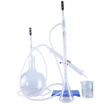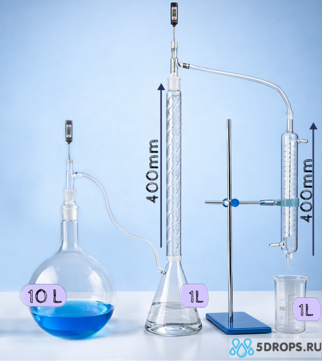 Конструкция включает перегонный куб объемом 10 литров, колбу Бунзена объемом 1000 мл, дефлегматор длиной 400 мм и змеевиковый холодильник на 19 витков. Увеличенная длина дефлегматора и развитая поверхность змеевикового холодильника обеспечивают эффективное разделение фракций и стабильную конденсацию паров при циркуляции охлаждающей воды.