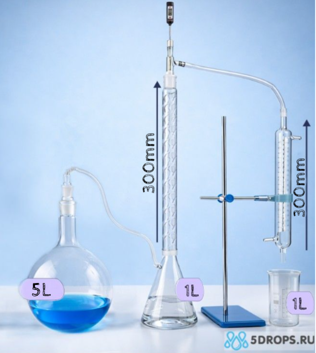 Конструкция включает перегонный куб объемом 5000 мл, колбу Бунзена объемом 1 литр, дефлегматор длиной 300 мм и змеевиковый холодильник на 16 витков. Спиральный холодильник обеспечивает эффективную конденсацию паров при циркуляции охлаждающей воды.