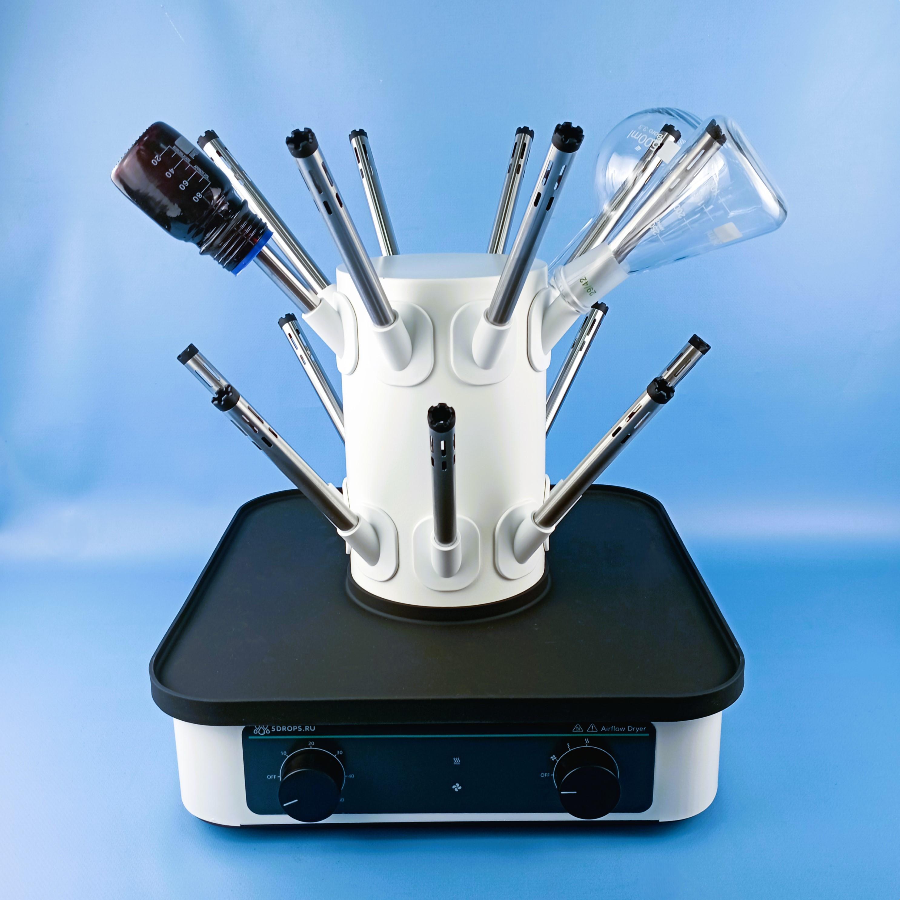 Суховоздушная сушилка для лабораторной посуды 5drops-AD-16. предназначена для быстрой и бережной сушки лабораторной посуды направленным тёплым потоком воздуха. Конструкция с несколькими воздушными каналами позволяет одновременно сушить десятки сосудов, устраняя остатки влаги внутри колб, стаканов и пробирок. Диапазон температуры выходящего воздуха от комнатной до 85 °C ускоряет удаление влаги без перегрева стекла. Есть таймер на 0-60 мин и защита от перегрева с автоматическим отключением нагрева при превышении порога.