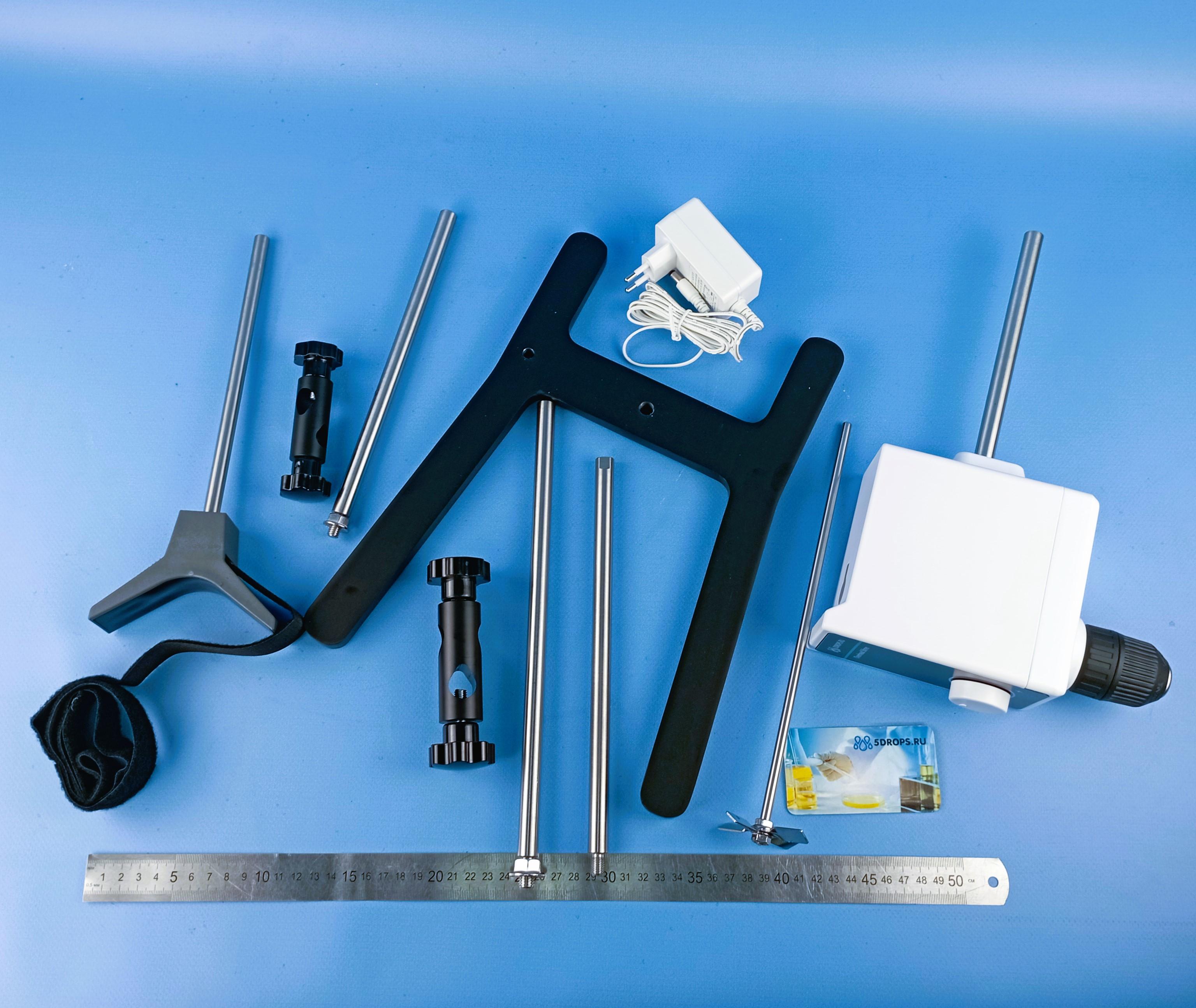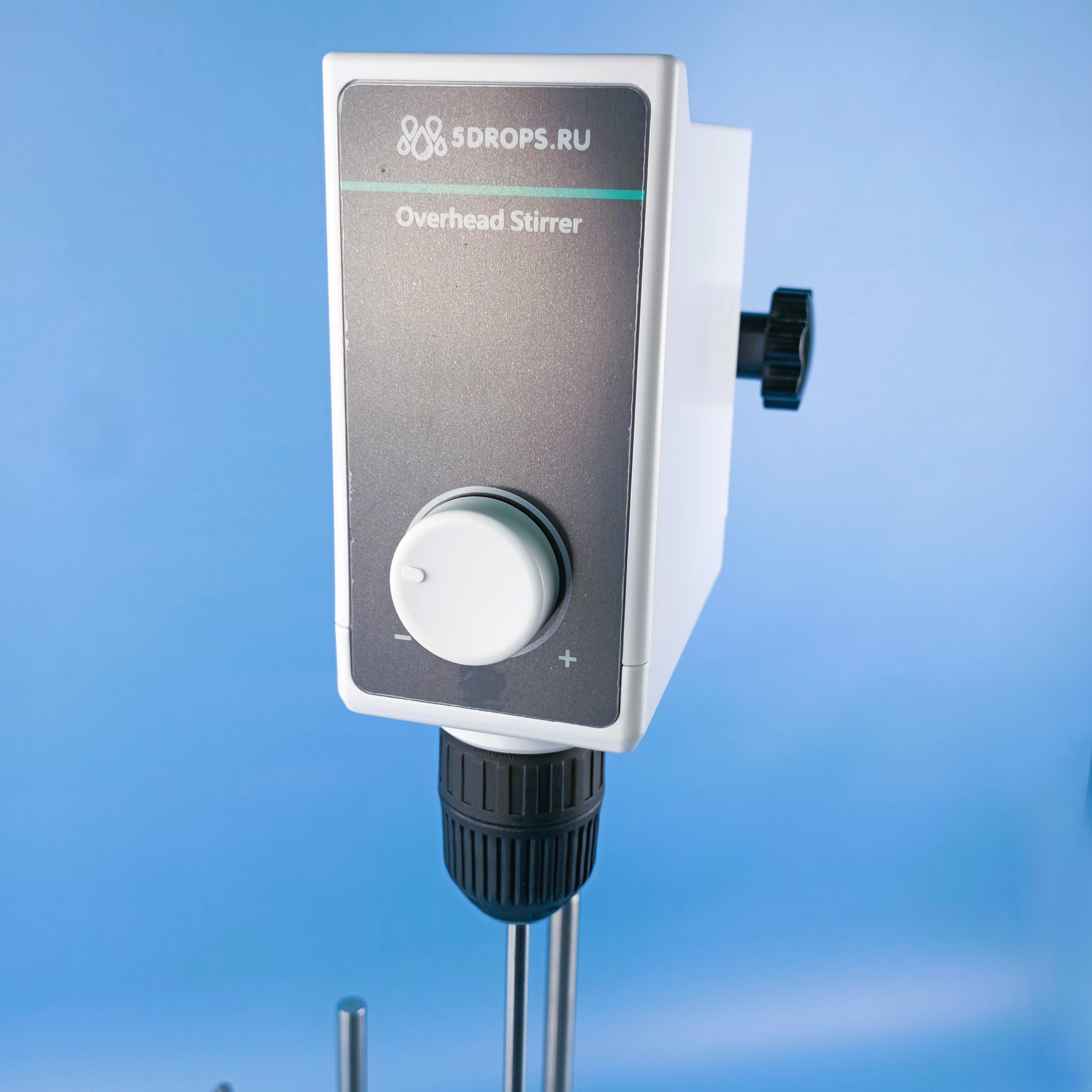 Верхнеприводная мешалка 5drops-OS-10, до 10 литров, максимальная вязкость 10000 МПа предназначена для равномерного механического перемешивания, гомогенизации текучих и вязких жидкостей, размешивания твердых частиц в жидкостях, приготовления суспензий, гелей, эмульсий, а также для внедрения газов. При использовании верхнеприводных мешалок — правильное соотношение размера емкости с параметрами перемешивающего элемента. Диаметр сосуда должен в два раза превышать диаметр перемешивающего элемента, а высота в два-три раза его высоту. В случае высоковязкого материла перемешивающий элемент должен находиться ближе к стенке сосуда. Верхнеприводная погружная мешалка состоит из привода и насадки. Привод – это электронно-механическое устройство, вращающее стержень (вал). На стержне расположена перемешивающая насадка (мешальник), которая удерживается специальным зажимом. Именно она контактирует с содержимым емкости и перемешивает его. Задачу гомогенизации химически активных веществ можно решать и с помощью других шейкеров. Механические двигатели у этого оборудования используются редко. Обычно, вращение насадки выполняет электрический мотор, а мешальники могут иметь конструкцию разных видов.