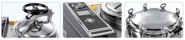 Как и вся серия LS-HG, эта модель имеет камеру и корпус из нержавеющей стали, электрический нагреватель и микрокомпьютерный блок управления. Оператор задает температуру и время выдержки на панели с цифровой индикацией, а дальше автоклав сам ведет цикл: нагрев, выход на режим, стерилизация, сброс холодного воздуха, охлаждение и завершение программы с подачей звукового сигнала. Быстрозапираемая крышка с маховиком и саморасширяющимся уплотнительным кольцом делает ежедневное открывание и закрывание камеры менее трудоемким, а система блокировки не позволяет открыть автоклав под давлением, что важно при многосменной работе.